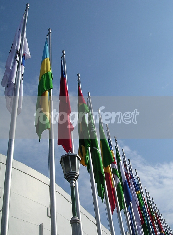 Penempatan ujung tiang-tiang bendera yang diagonal membelah frame sangat hidup. Kontras warna langit dan warna-warni bendera cantik. Salam.