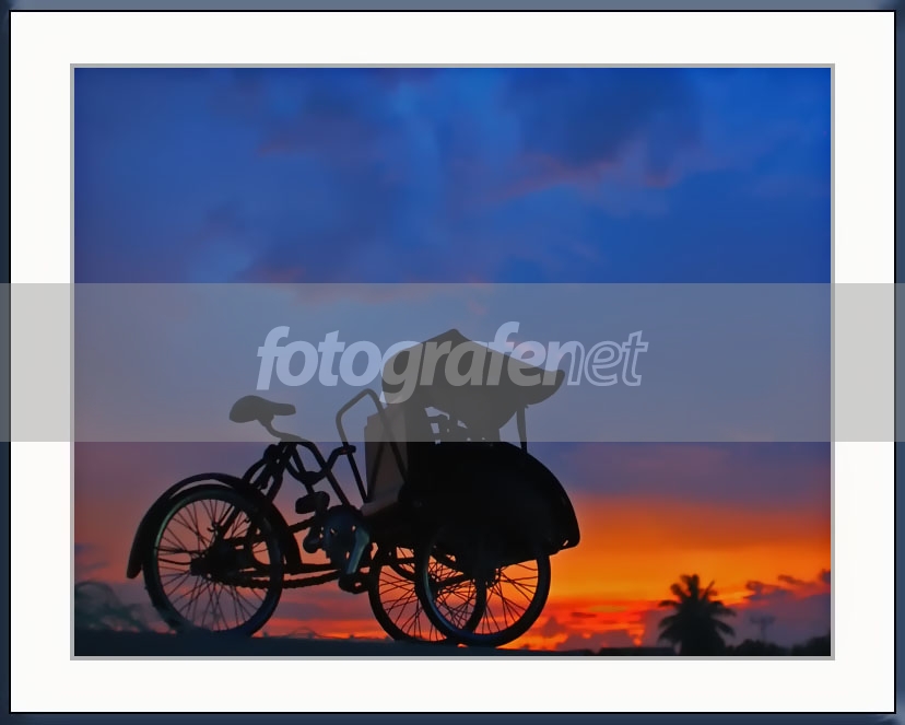 mencoba mencapture senja, dengan obyek becak di foreground, background noise di remove dengan neat image, post processing ps resize, frame dan crop