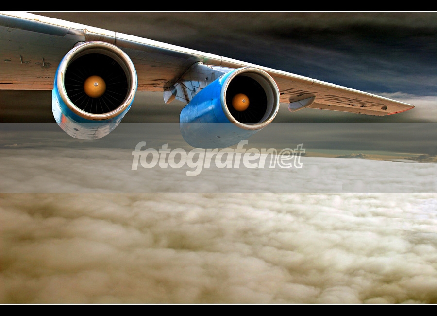 Bagus sekali... jarang sekali melihat mesin2 pesawat dari angle seperti ini (yg dlm posisi sedang terbang)... Selain itu, adanya awan yg bagus patternnya memperindah foto unik ini! :)
