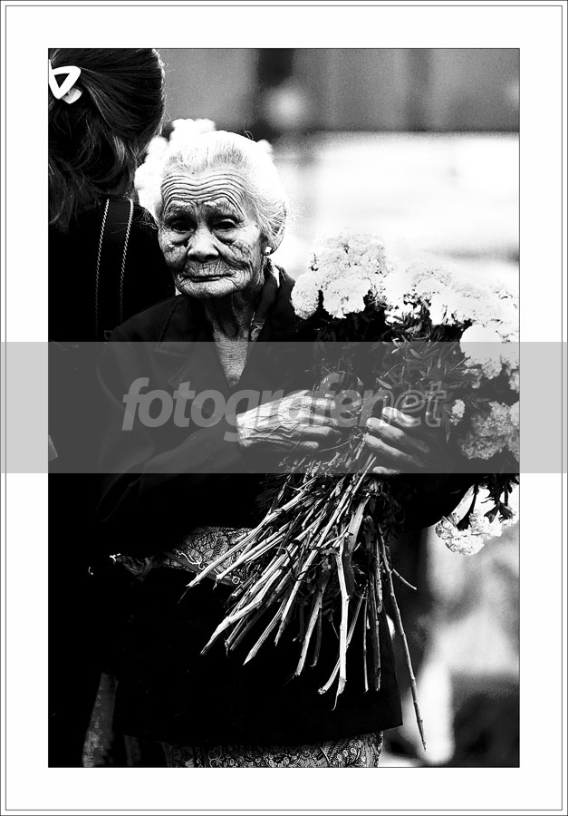 Hmmm ekspresi di mbah yang pas banget!... terekam apik... di usia senjanya ini yang seharusnya sudah waktunyamenikmati hidup.. masih harus bekerja dengan menjual bunga.. hmm.. ironis.. sementara yang muda2 malah jadi preman!. FG gadis berpita sedikit mengganggu.. tapi yang palign mengganggu.. itu BG putih yang lebih terang dari si mbah! sehingga si mbahnya.. ngga jelas tergambar!> (bisa di burn di PS). imho.. Salam........ (^o^)v