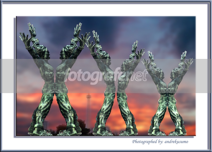 Olahannya sepertinya over sehigga detail patungnya jadi datar ...idenya bagus cuman sekedar saran mungkin sebaiknya fotonya yang tiga disusunya dari yang kecil ke yang besar dan posisi fotonya dibuat dari lengket , setengah lengket , dan lepas ...jadi sesua judulnya bebas ...akan lebih terasa ...semoga berkenan