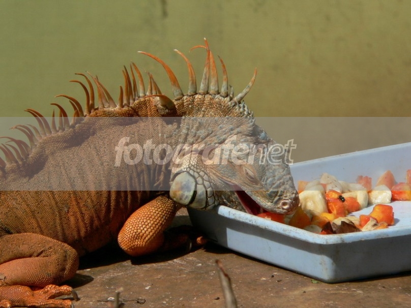 Iguana iguana, Green iguana jantan. Pose kurang menarik karena baskomnya sangat mengganggu.