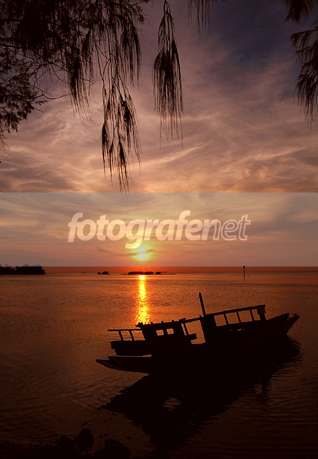senja yang cantik, siluet kapal & daun fgnya cakep...karimun memang surga... salam...