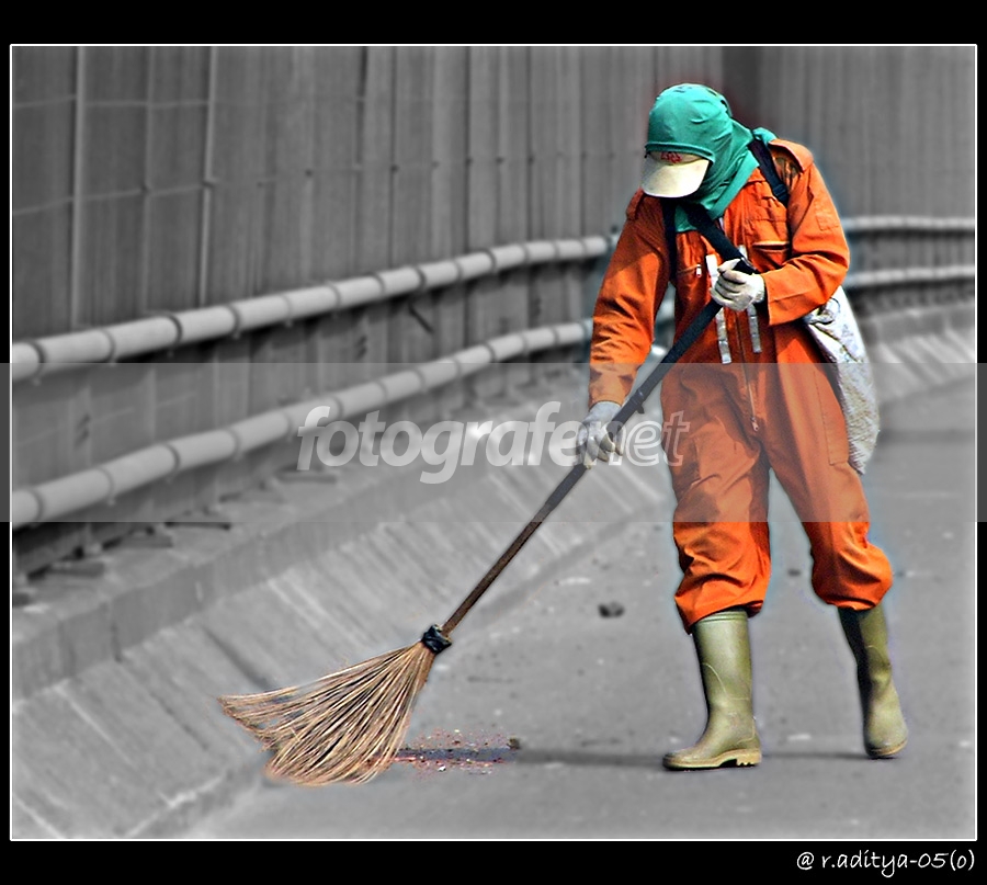 tiap pagi di jalan tol dalam kota, selalu terlihat tukang sapu jalan yang berkostum oranye spt ini....pake penutup muka segala, krn polusi dan debu , kasian ya...sebelum kita bangun aja, dia udah kerja kali di ssana..berapa kilometer yang harus dia bersihkan tiap hari...rnsadarkah kita akan orang2 kecil spt ini yang seringkali diabaikan atau terabaikan dalam kehidupan kita, coba bayangkan apabila tidak ada mereka...sampah dimana2....rnrnPS cs u layer copy, masking, brush tool, resize, krop, levels, desaturate u background, gaussian blur dan framing...rnsemoga berkenan, kritik dan saran diterima....