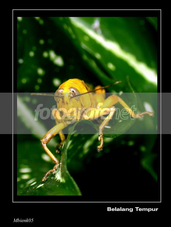 lucu banget sih modelnya, disebut belalang tempur karena bentuk kepalanya mirip helm tentara nazi yah? :p nice makro, komposisi warnanya nice and simple, kalo diliat2 cuma ada 3 warna tuh, hijau, item dan kuning....