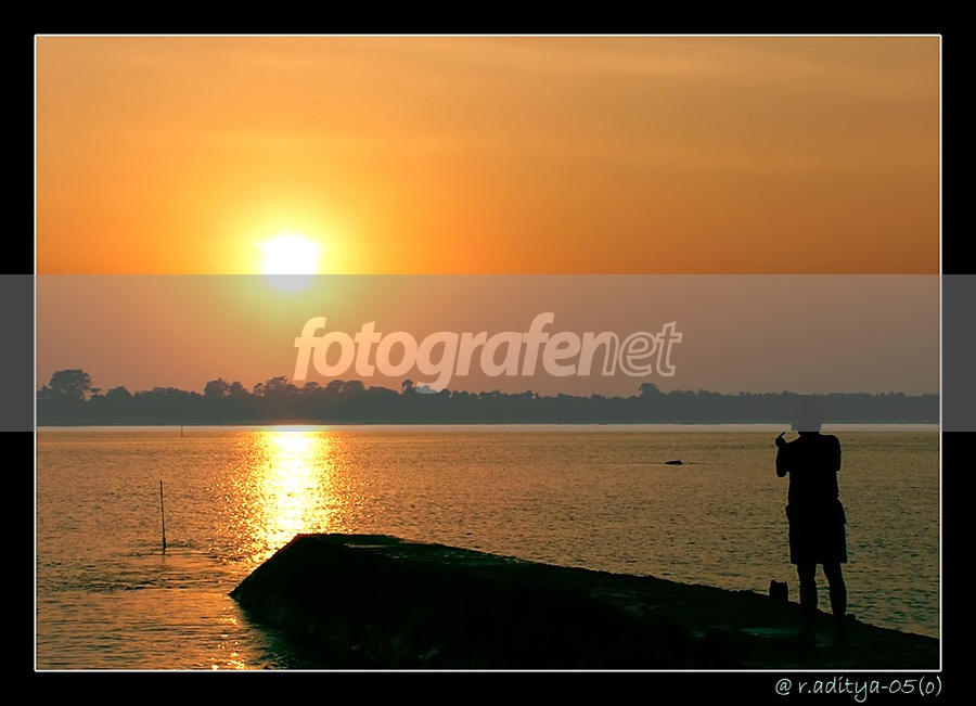 Merekan moment sunsetnya sudah pas, hanya.... disini dalam pemilihan anglenya membuat profil siluet orangnya terpotong dengan garis horison daratan diseberangnya, ada baiknya, jika memungkinkan ubah angle kameranya lebih keatas shg kepala orangnya bisa masuk perada di latar belakang perairannya. Salam.