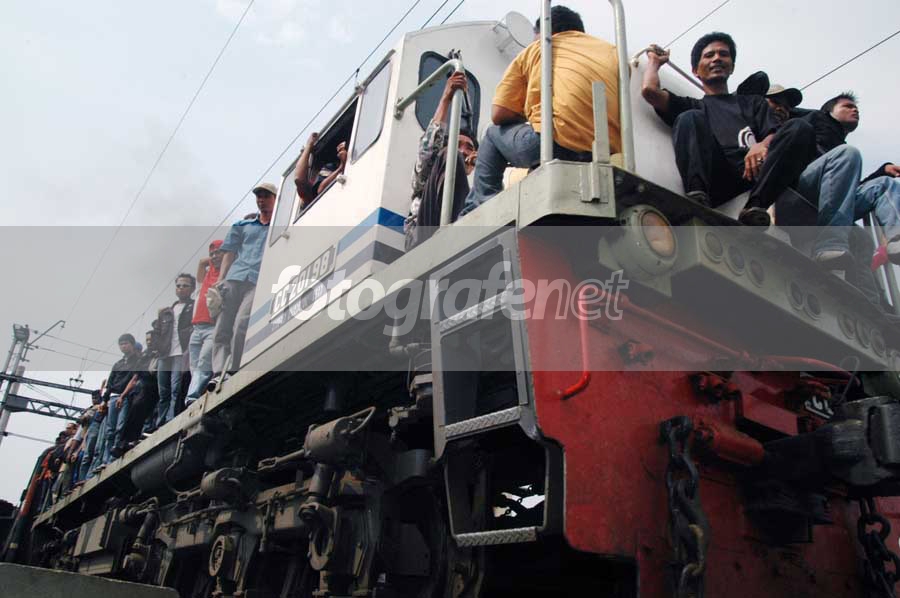 Date Time Original: 2005:10:30 14:05:01, MUDIK. karena semua gerbong kereta api sudah penuh, puluhan penumpang nekat menaiki lokomotif KA ekonomi Kertajaya jurusan pasar senen-pasar turi surabaya. Mereka memilih mudik dengan KA ekonomi karena tarifnya masih terjangkau isi kantong.