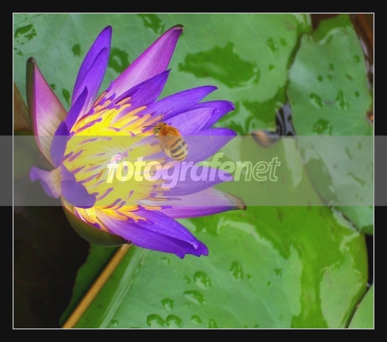 Seekor lebah sedang asyik memburu manis madu di bunga teratai yang mekar. Pada suatu pagi yang sejuk. Di sekitar TMII. Tahun lalu.