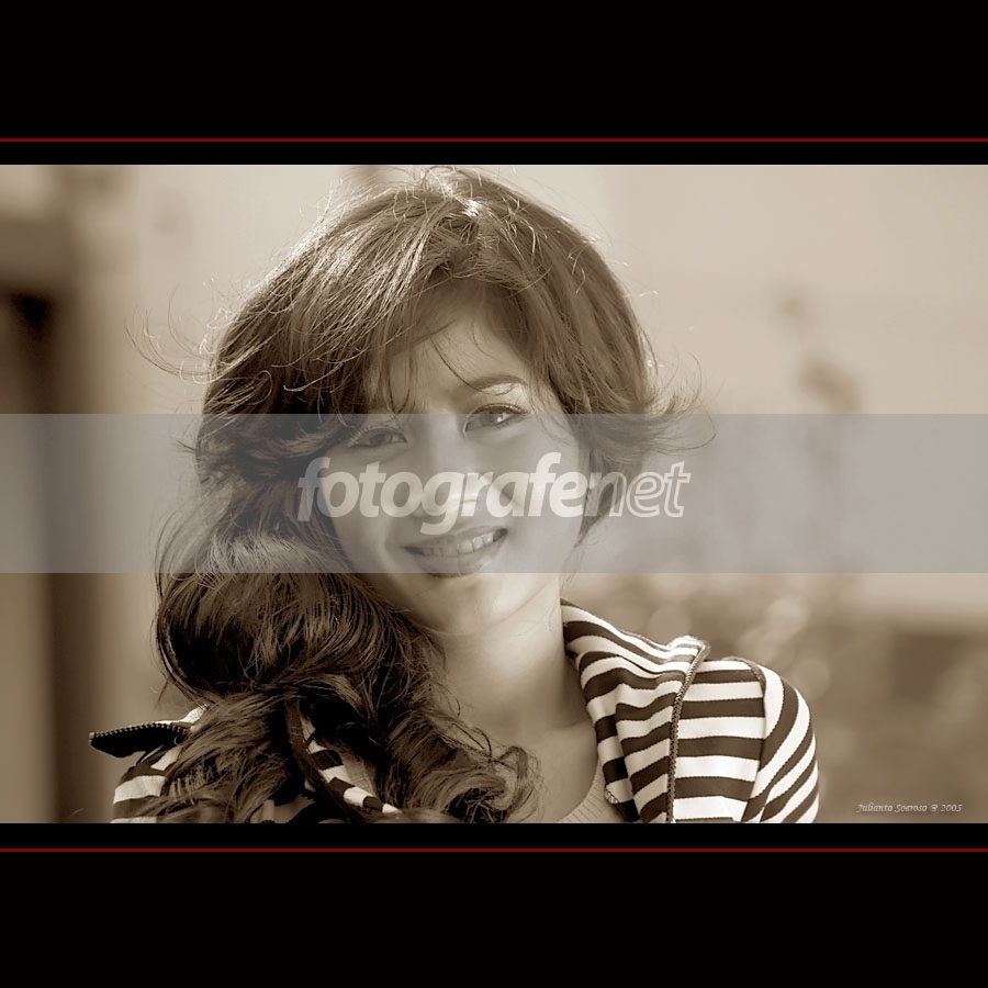senyumnya sang model mantap, sephia tone-nya ok, hair light-nya pas, BG blur.