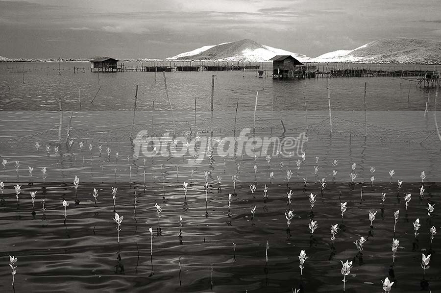 titik-titik tumbuhan bakau yang baru muncul di air jadi elemen komposisi yang kuat. komposisi dan tone BW excellent. bravo!