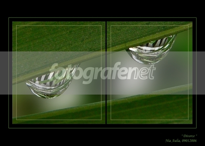 Satu foto, tapi dibelah dua :)rnrnPas bikin ini .. lagi dengerin berita cerai-2nya artis-2 di infotainment ... hueheheh *emak-emak banget gag sih ?*rnrnAkhirnya, terlintas deh ide buat \'menceraikan\' foto ini ^_^rnrnBayangan yg tampak di tetesan air itu adalah taneman, pagar dan tembok rumah saya.rnrnRgd,rnNia Auliarnrn@ Riefa ; Rief .. aku mah gag masalah kalo di TD, silahken ... rnAsal gag dituduh upload foto reproan aja, sbab foto-2 yg ada disini asli karyaku.rnAku masih cukup waras kok di FN ini ^___^