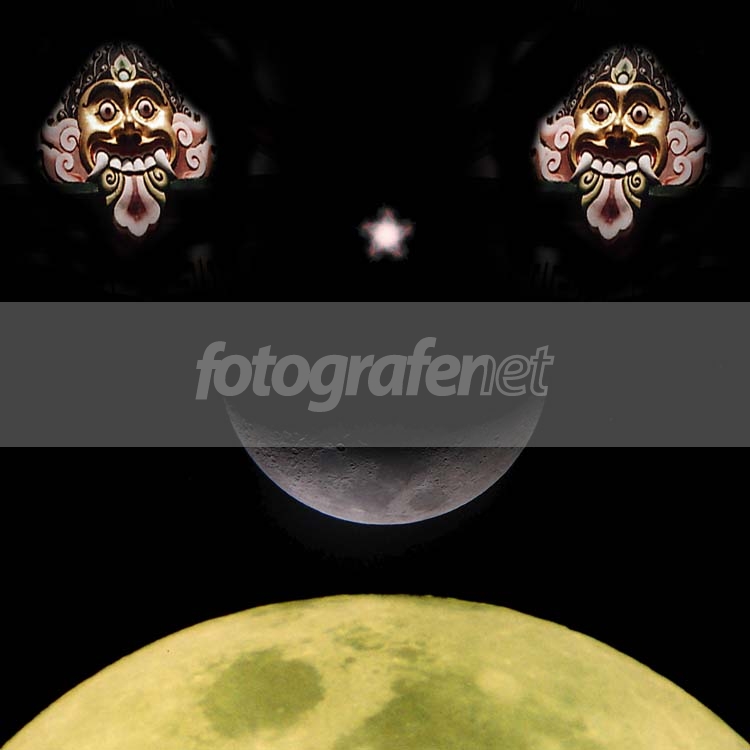 wah.. ini namanya ASTROPHOTOLOGY gabungan astrophotography dengan astrology.. huehehehehehe... :D ornamen kepala raksasa itu namanya (di Bali) adalah "Kala"... yang berarti juga dimensi waktu... ga tahu di Jawa... :) kalau saya sih melihatnya sebagai semesta yang ber-formasi: mata, hidung dan mulut menganga di alam raya... hiii.. ngeriiii... Selamat Tahun Baru 1 Muharram NBY