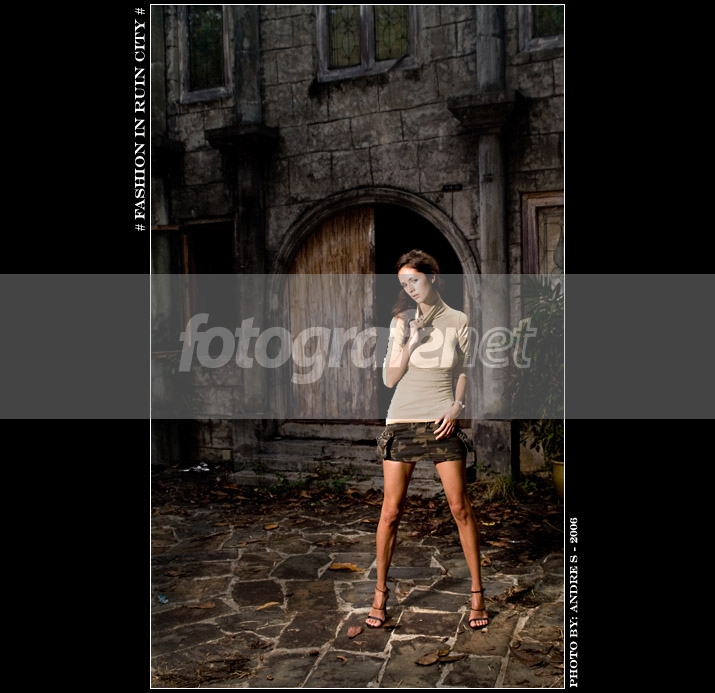 Hasil foto kemarin di daerah sentosa yang sudah gak diurus. Temanya mo bikin "Wild and Fashion" kemudian ketemu ama bangunan mirip castle yang dah gak diurus jadi mungkin dikasih judul "Fashion in Ruin City"rnrnFoto pake outdoor strobe satu buah disebelah kiri, disiang hari bolong, trus mo nyoba high speed biar background nya terkesan mistis.rnrnFoto kemudian diolah (burn and dodge) menggunakan PS CS2.rnrnKeterangan alat tambahan:rn- Minolta 7D Pinjeman rn- Asa 100 + RAW modern- Minolta 24-105 D Lens rnrnSemoga berkenan.....