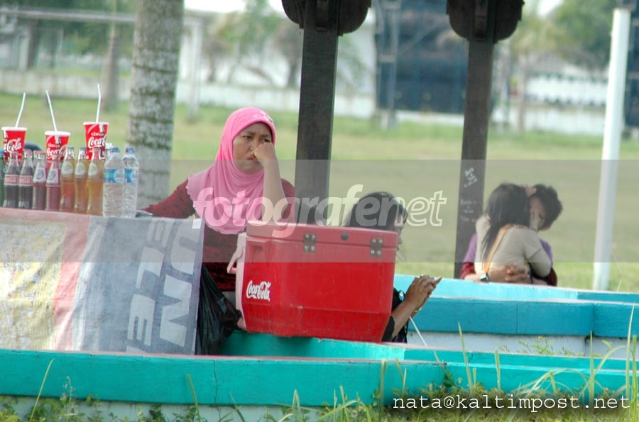 Ya... Mungkin itu yang ada dibenak kepala sang Ibu pedagang kaki lima di kawasan Tepian Mahakam, Samarinda, Kaltim ini. Bagaimana tidak, seharian dirinya berdagang minuman, pembeli sangat jarang menghampirinya.. Atau bisa jadi karena sang ibu ini tak sadar jika dibelakangnya ada sepasang remaja yang tengah asyik melepas hasrat cintanya.. Ya, itulah realita di kalangan remaja saat ini.. Mereka benar-benar mengadopsi budaya barat, di mana mereka sudah tak malu-malu lagi untuk berciuman di depan umum. Pantas saja banyak sekali yang kontra atas keinginan pemerintah untuk segera mengesahkan RUU APP... Dasar pornoaksi...!!! (Minggu, 21 Juni 2006 pukul 16.00 Wita.nnnDate Time Original: 2006:05:21 16:00:02