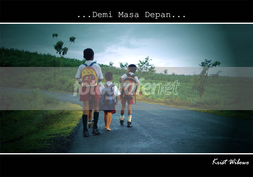 Sekolahnya ada di balik bukit itu...kira2 masih 1 km dari lokasi...Sebelumnya mereka sudah naik turun bukit dan melintasi hutan jati yg sebagian sudah gundul untuk sampai ke Jalan besar ini..rnDengan kabut yang masih menggantung..Jalanan dan rumput masih basah...dengan semangat mereka mencari ilmurnrnDemi masa depanrnKet : Horizontalnya tdk miring...kesan timbul karena jalannya mendaki/miring dengan kemiringan 30an derajat...sehingga tidak saya koreksirnrnPS: Lightning, Duplicate layer ,Gaussian Blur, Blending