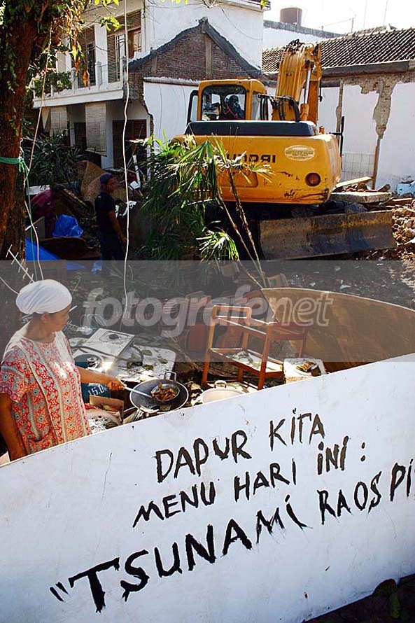 Seorang Ibu tengah menggorang ikan asin di pekarangan rumah dan penginapan miliknya yang rusak berat akibat tsunami di Pangandaran. Sementara sebuah alat berat tetap bekerja memindahkan reruntuhan rumah dan penginapannya.Papan bertuliskan "Tsunami Enak Sekali" (tsunami raos pisan-Sunda) rnMoral: Tetap jaga sense of humor seberat apapun bencana yang melanda. What a fighting spirit.rnrnDate Time Original: 2006:07:22 08:34:40rnISO Speed Ratings: 100