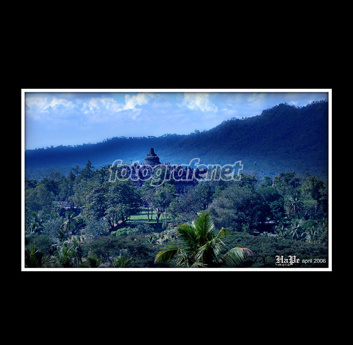 Good view. Borobudur dibalik pepohonan..... Dikasih masking ya Mas, antara bukit di belakang candi dengan candinya?