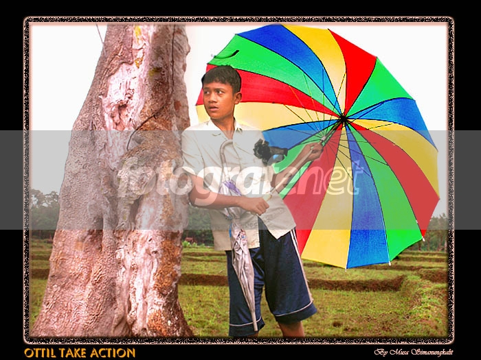 nice komposisi, terjadi penyeimbangan objek yaitu batang kayu yg terkesan berat dengan payung yang berwarna-warni....
