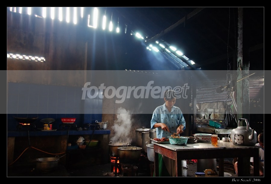 Pilihan shutter dan diafragma yang pas, semua detail tercapture dengan baik termasuk cahaya dan uap dari panci (kalau lebih slow mungkin jadi lebih asik). Api di kompor ngasi aksen tersendiri diantara kegelapan. Saturasi warnanya enak tempat ini jadi lebih ceria. Salut!