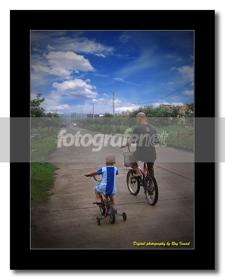 Date Time Original: 2007:02:03 17:57:06nnkompak banget nih bapak sama anak..., ceritanya saya lagi keliling komplek naik sepeda motor, begitu lewat..., di depan saya kok ada yang menarik perhatian gitu..., soalnya agak-agak kinclong..., begitu saya sadar, bapak sama anak ini udah kelewat, saya pikir kok sayang kalo nggak dijepret nih.nnakhirnya setelah saya susul, kira-kira 100 meter didepan mereka saya berenti, pura-pura nyalain rokok sambil diam-diam ngeset kamera..., begitu mereka lewat...., langsung deh saya jepret..., hehehe..., cuma sayangnya hanya ini satu-satunya foto yang saya dapet..., soalnya dalam hitungan detik aja mereka udah jauh lagi..., nggak mungkin khan saya kejar lagi?! :)nnberhubung lagi musim ujan dan banjir, awan mendung saya timpa lagi pake yang berawan alias sandwich, thanks untuk yang udah mampir, liat-liat dan berkomentar..., semoga cukup menghibur..., salam!nn:)