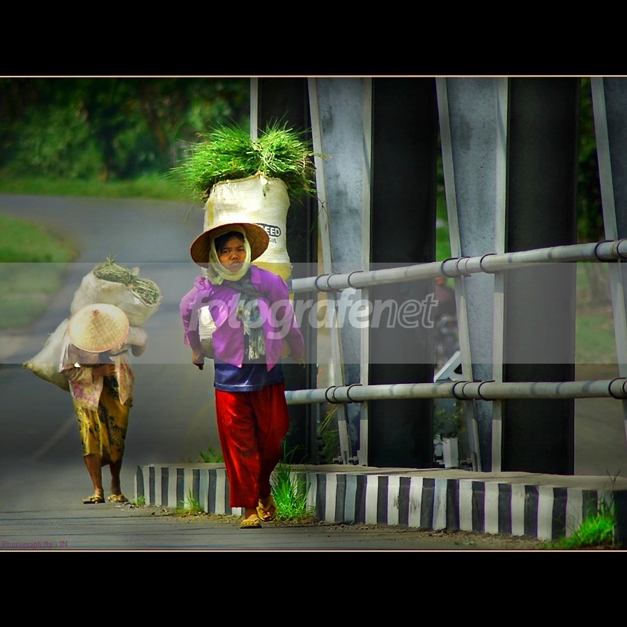Saya tidak tahu apa yang melatarbelakangi keluarga ini sehingga setiap hari harus berjuang [mencari rumput], dan apa juga yang dikerjakan para suami mereka. Lihatlah wajahnya, tidak sekalipun ada rasa putus asa, mereka tidak lemah, bahkan lebih dari sekedar tegar menghadapi kehidupan monoton... [mungkin hanya heran melihat saya jongkok dari kejauhan. Rute jalan ini sering mereka lewati, dan jembatan ini juga satu satunya jalan penghubung menuju 'kota' kesil di sebuah desa, kandangan rnrnsalam terhebat buat wanita pejuang keluarga....