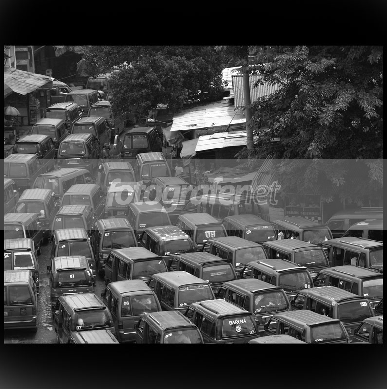 Sudut pengambilan yg indah, warna dibuat BW dengan pola angkot berbaris dan back lighting menjadikan foto ini bagus.