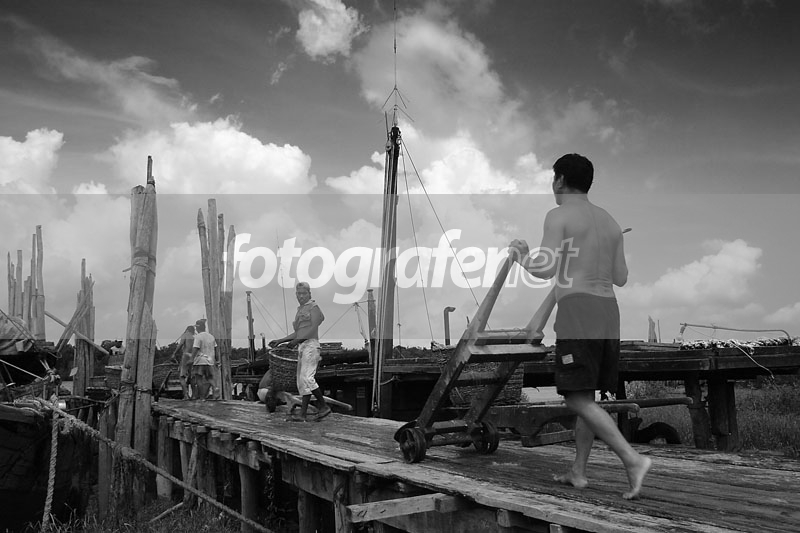 elemen2 vertikal tiang dan orang terkomposisi manis dalam bidang diagonal tipis dermaga. momennya juga hidup.