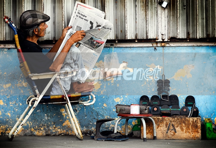 seorang tukang kasut jalanan di Johor baru sedang membaca koran sambil menunggu pelanggan di pagi minggu...