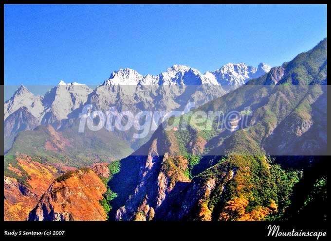ISO 100 ; FL 8 mmnLandscape ModennMasih stok dari Tiger Leaping Gorge Track di Yunnan. Gunung yg berpuncak salju tsb Jade Dragon Snow Mountain. Foto aslinya foggy sekali.. diolah pake PS main shadow hightlight contrast & saturasi.. dikotak-katik masih grainy.. semoga bisa dinikmati aja viewnya... terima kasih u/mampir & masukan2nya :)
