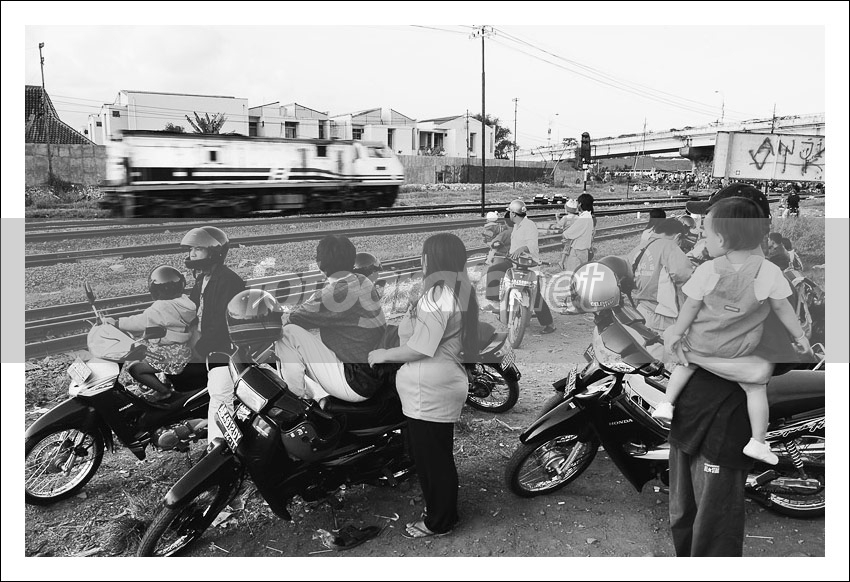 Wueehh... Masihs setia dengan trainwatching, Mas... Tema apik... Biarpun lalulalang tiap hari, kereta api masih saja jadi tontonan. Efek gerak + kompos + tone BW: buagusss...