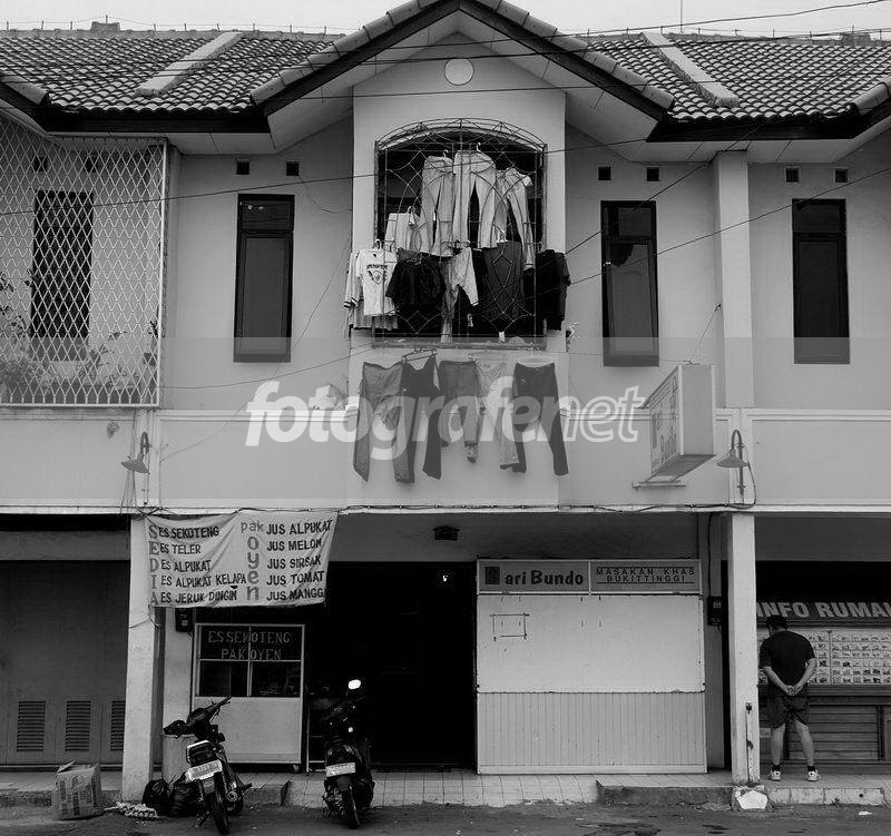 Selling the goods to make a profit is one of the way of making money and people have to be smart to sell itrnIn this photo you could see some "Goods" in front of the second floor windows and on the first floor is another business, Restaurant.rnThere are two interpretations to this photo :rnThe first interpretation, The owner of this building might have a restaurant on the first floor and on the second floor, they might have another business, selling clothes or in popular term is "Boutique"rnThe second interpretation, the owner might have a Restaurant but they don't have enough space to dry their clothes so being a creative person, they put the clothes on the second flooernBoth interpretation might be correct for one purpose : maximazing the space because the land and the building is very expensive.