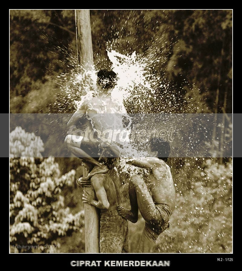 Musim Tujuhbelasan kembali datang. Artinya, lomba panjat pinang pun kembali muncul, tak terkecuali di lingkungan tempat saya tinggal.rnDalam lomba ini, setiap kali sebuah regu berusaha memanjat batang pinang yang licin karena minyak, regu-regu saingannya diperbolehkan "mengganggu" dan menghambat laju regu yang sedang dapat giliran memanjat dengan menyiramkan air ke para pemanjat.rnBiar murah yang penting meriah. Biar sengsara, yang penting MERDEKA!