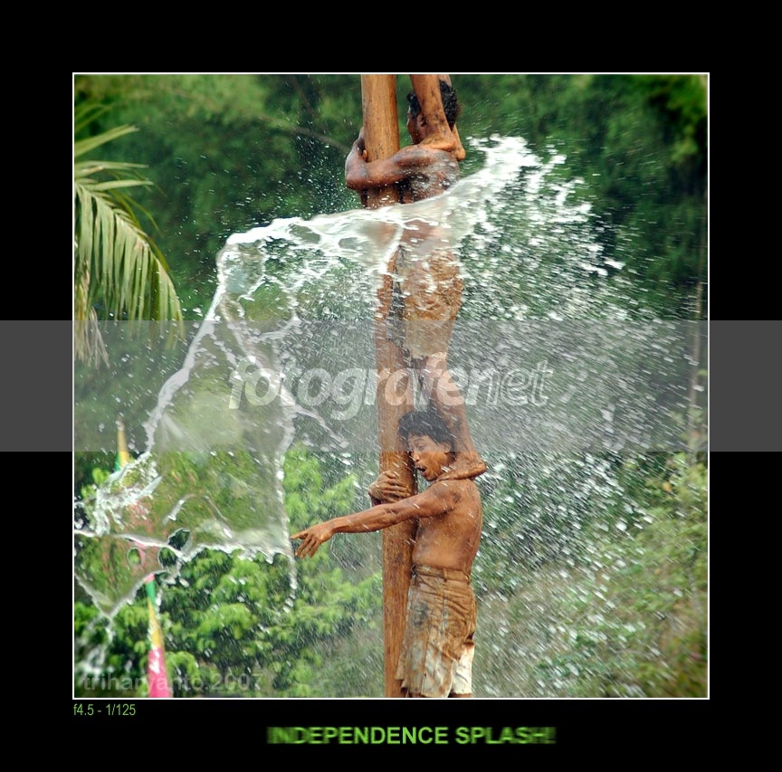 Becoming more and more of a ritual, celebrating Indonesian independence has almost always been cheered with the "panjat pinang" (palm pole climbing) competition. Then, in this slippery game, water splashes have almost always been another ritual to further cheer up the moment.rnThanks for visiting. Best regards.