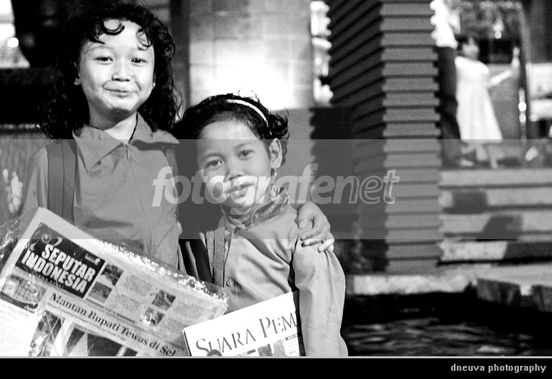 Dia baru saja menelanjangiku.------rnrn"Tante Koran Om... buat nambah bayar uang sekolah", ucap Nana (10 tahun, kanan foto) jajakan korannya padaku yg lagi duduk ngaso ditangga teras FO (Factory Outlet), selonjorkan kaki. "Tante Koran Om..". Kalo menurut Bahasa Indonesia EYD (Ejaan Yang Dibenarkeun), kalimat Nana itu aneh sekali, subject semuanya, gak ada Object dan Predikat. agak2 gatal telingaku mendengarnya. rn"Ahh, kamu mah paling juga duitnya dipake buat beli Oreo..", begitu godaku, demi melihatnya nawarin koran sambil cuek muterin dan jilati biskuit Oreo di tangannya. Korban iklan tv kah? rnNana: "Yeee,, ieu mah Oreo dari Bapak yg itu.." (sambil menunjuk laki2 dan anak kecil di belakangku).rnAku: Ooh kitu.. emang sabaraheun kitu hiji na?" (O gitu. Emang berapaan gitu korannya satu?, red.).rnNana: (cuek monyong ngejilatin Oreo) "Dua rebu, tan" rnAku: "Dua rebu trus kamu ngambil untungnya berapa?" rnNana: "Gopek hungkul, Tan.." (500 perak doang, Tan.., red.)rnAku: Ooo. Gini ajah deh.. Tante kasih kamu 1000, gak usah pake koran. OK?"rnNana: "Gak mauuuu ! Beli korannya aja, Tan..!"rnAku: "Lho, kenapa..?! Kamu khan malah untung lebih gede. 1000 Perak masuk kantongmu semua, sedangkan kalo tante beli koranmu 2000 perak, yg masuk kantongmu cuma gopek." (debatku sambil sok pinter ngajarin dia ilmu berdagang).rnNana: "Jangan Taan.. Beli korannya saja.. (tidak tergiur dan tetap tidak lepaskan pandangannya dari Oreo yg ada digenggamannya..) rnAku: Hmm.. Koranmu isinya cerita horor semua.. liat aja tuh, Mantan Bupati tewas di Sel... males ah bacanya. Ya udah gini ajah, tante kasih kamu Duarebo ngga usah pake koran, kumaha? Jadi uangnya buat kamu semua gak usah kasih ke Boss mu" (masih dengan sok pinterku berilmu dagang, berusaha "tawarkan" hal yg lebih menggiurkan padanya).rnNana: "Jangan Tan.. beli aja korannya...biar cepat habis jadi saya bisa pulang ngerjain PR. Ini sisa 5 lagi, di Aa' masih ada 10 lagi. Kemarin saya kena setrap sama Pak Mahmud Guru Agama.."rnAku: (nahan ketawa melihat ekspresi Nana. koq jadi curhat) "Kunawon..?" (kenapa? red.)rnNana: "Lupa bikin PR. Kemaren pulang rumah jam 10, sayah teh ketiduran lupa bikin PR. Ini kaki sayah dipukul pake penggaris sama Pak Guru trus disetrap...". rn----------rnAhhhh Nana.. si kecil penjaja koran eceran yang jujur.rnDitolak Nana "sogokan" 1000 bahkan 2000 perak dariku, walaupun dia tau untungnya akan lebih besar buat dia. Tapi demi tanggung jawab yg diembannya, dia tetap pada target jualannya.rnAhhh, Nana.. Totalitas-mu hilangkan pegal kakiku. Gambaran Anak Bangsa yg kulihat di kota kembang kemarin. Terharu dan takjubku melihatnya. Aku percaya, masih banyak Nana-Nana lain di tanah air kita, seperti Nana penjaja koran ini... nana anjang, nana endek, nana olol.. ha ha ha..*kidding* rnAhh Nana, tidak taukah kamu bahwa lewat keteguhan hatimu itu, baru saja kau ajarkanku tentang nilai Tanggung Jawab, Totalitas dan Kejujuran. Kau baru saja menelanjangiku yg sok jadi malaikat ini, Nana..rn ------rnSpecial Thanks to MLJ atas selembar 10 ribu rupiahnya buat Nana.. Mari kita habiskan 5 koran ini bersama-sama sambil menikmati secangkir kopi hangat Dago:">Terima kasih buat yg sudah singgah. Kritik masih tetap kuperlukan utk mempercepat pertumbuhanku. Salam,-rnDate Time Original: 2007:08:18 19:19:07rnISO Speed Ratings: 800