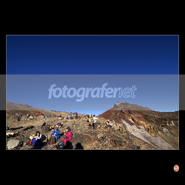 Waktu menunjukkan 05.46 pagi.nSatu jam setelah matahari terbit. nnAku menyiapkan tempat untuk tidur sebentar. Disisi kawah yang masih terselimuti salju. Dibelakangnya ... merupakan puncak tertinggi 3.776m.nnKita tidak bisa menikmati hijaunya tanaman, sejak dari ketinggian 2.400m.nnDari Catatan perjalanan : Menjemput Matahari, Fujiyama Photo Expedition 2007.