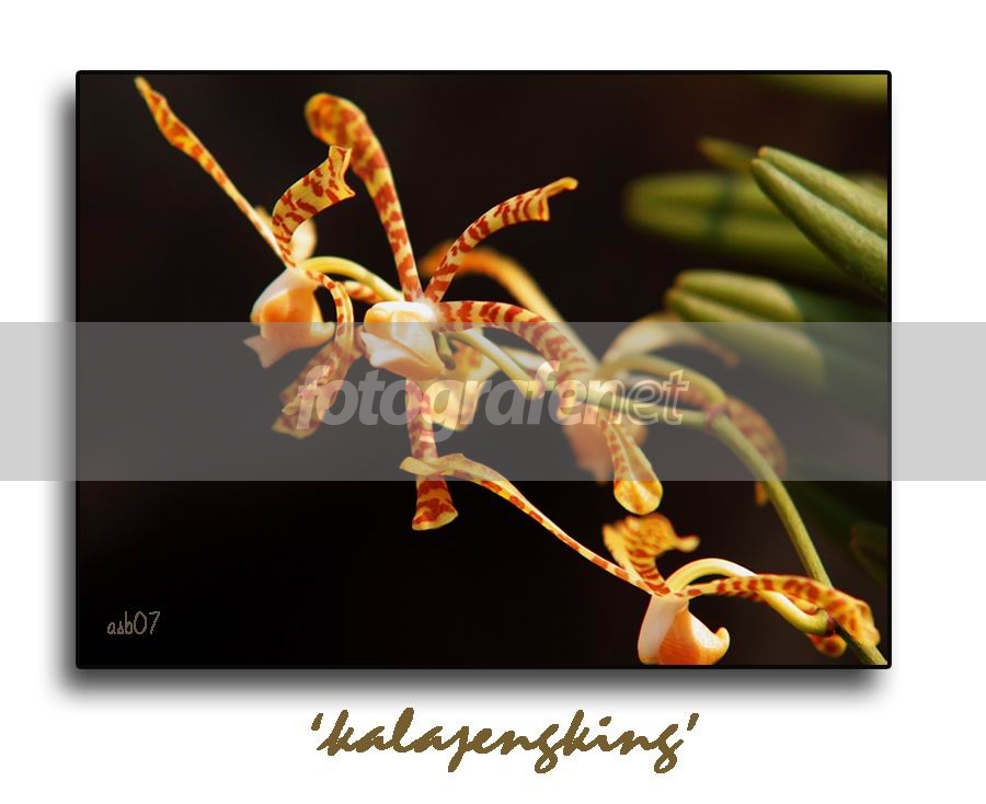 Arachis flos-aeris, maaf kalau salah; adalah salah satu species bunga anggrek. Kita sering menyebutnya dengan Kalajengking... mungkin karena bentuk dan warnanya yg mirip kalajengking. Diambil di depan rumah ketika sedang mekar2nya. Mohon saran dan kritik teman2. matur nuwun