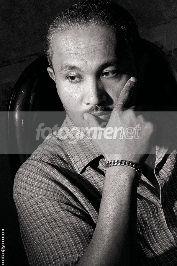 Model : Pak FennOom..oom...serius banget, ketawa napa..pelit banget sih senyumnya.nnLagi nyoba2 jepret mengandalkan lighting, mencoba bermain dengan bayangan untuk menghasilkan satu gambar yang berkarakter kuat. Untuk itu diatur lampunya untuk membentuk shadow dibagian muka dan dibajunya. nnSetelah itu hasil jepret dikirim ke PSCS2 untuk dibuat menjadi B/W dengan cara mengurangi saturasi hingga 0,dan memainkan colour balance,brightness/contras dan selective colour. Dan ditutup dengan high pass untuk menajamkan gambar agar lebih berkarakter. nnSekian dulu komen dari aku, mohon maap kalo hasilnya lom memuaskan dan thanks atas saran, kritikan dan komen dari oom dan tante yang baek hati dan tidak sombong. Salam salim