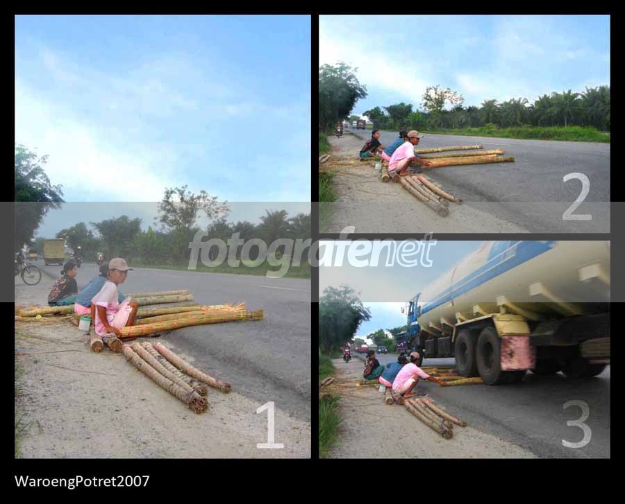 1. Para ibu pengrajin tikar membawa beberapa ikat purun kering untuk dibuat menjadi tikar.rnrn2. Ibu-ibu pemberani ini mempertaruhkan nyawanya, bersiap-siap untuk menggiling purun-purunnya.rnrn3. Kraaakk.!!!! Sebuah truk besar melindas purun-purun yang dilintangkan oleh ibu-ibu dijalan raya.