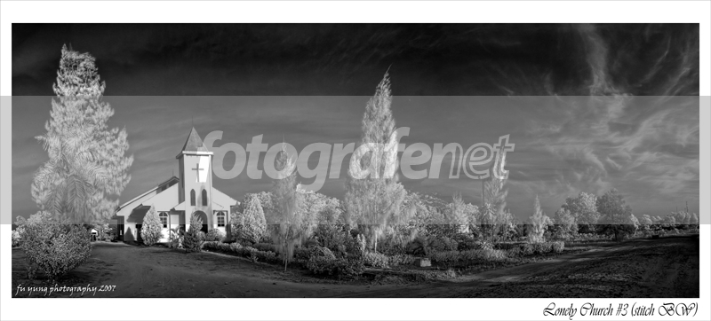Nikon D200 V3+ rnLokasi : CPB Pondsite - Tulang Bawang, Lampung Tengah rnrnkarena gak mampu beli lensa wideeeee (mahaalllll deh) aku coba rnstitch dari 5 frame yang berbeda supaya dapet kesan ultra widenya rn rnrnWhen the night is still rnAnd the sea is calm rnLonely shadow, you fall upon me rnLay by my side rnFear not tonight rnrnLonely shadow, you’ll find a new light rnDream a dream rnAnd see through angel’s eyes rnA place where we can fly away rnRide with me upon a shining star, rnAbove the moonlit sky rnWe will find Elysium rnHear the nightingale rnSing a lullaby rnrnLonely shadow, you’ll find a new light rnDawn will be kind, rnAll will be bright, rnLonely shadow, rise from the darkness rnDream a dream, etc. rnAnd see through Angels's eyes rnA place where we can fly' rn rn rnBahan - bahan yang diperlukan : rn - Camera : Nikon D200 rn - Format : NEF rn - Date Time Original : 10/3/2007 17:25:39 rn - Dimensions : 3872 x 2592 rn - Exposure : 1/125 sec at f/8.0 rn - Exposure Bias : -1 EV rn - Flash : Did not fire rn - Exposure Program : Manual Priority rn - Metering Mode: Spot rn - ISO Speed Rating : ISO 200 rn - Focal Length : 18mm rn - Lens : Nikon 18-55 f/3.5 - 5.6 DX AFSrnrnCara memasaknya : rn - Olah file NEF menggunakan Nikon NX lalu convert ke TIFF rn - Stitching / gabungin ke 5 frame tersebut menjadi 1 rn - Tunning dikit dengan CS2 lalu sajikan dengan Framing - Title & Resize dari CS2 rn rnSekarang "Lonely Church #3 (stitch BW)" siap untuk disajikan .... selamat menikmati rnrnTerima kasih banyak buat FNers yang sudah berkenan mampir dan memberikan kritikan dan masukannya yang pedas ... salamrnrnSemoga Damai Natal selalu memberkati kita semua ... GBU alls