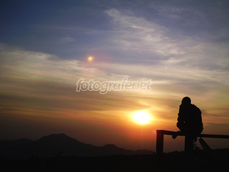 Date Time Original: 2006:12:11 17:44:48nISO Speed Ratings: 100nnWaktu nemenin saya jeprat-jepret matahari terbit, Agus sang model dalam foto ini nerima panggilan telpon di HP-nya. Di kala dia asyik ngobrol sambil duduk di bangku suatu lapangan, diam-diam saya foto siluetnya yang seperti seorang duduk bersila sambil merenungi pagi. nKarena berhadapan langsung dengan sumber cahaya, pantulan sinar matahari terekam dalam foto ini.