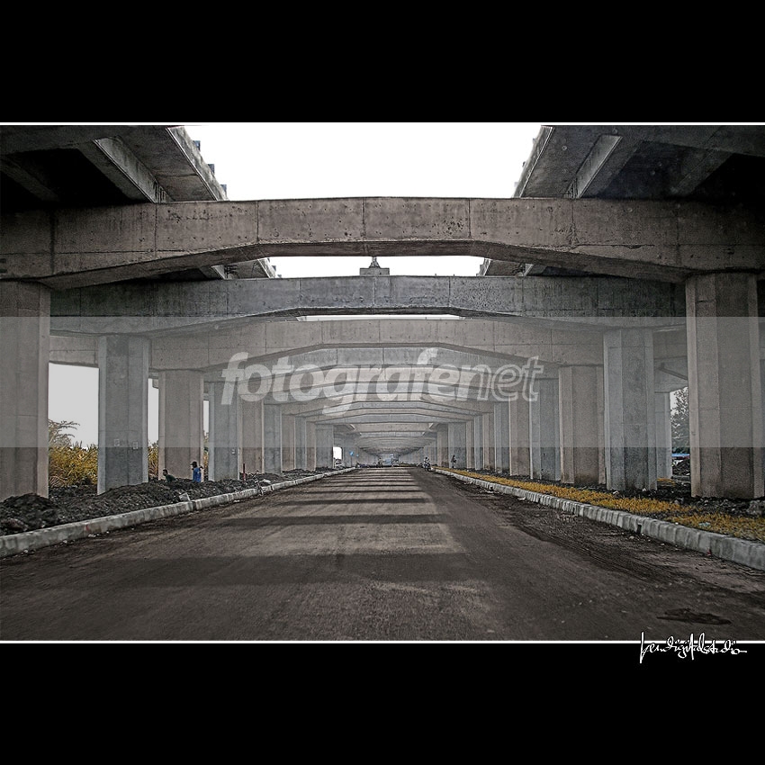 Jajaran pilar-pilar dan tiang-tiang beton dalam struktur geometrik yang ritmis. Struktur beton repetitif yang bagus. Tonal beton berseling merah biru, membuat foto bagus ini jadi terasa aneh, saya tak mengerti idenya. Salam...