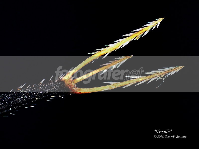 Biji rumput (bag. berwarna hitam) yang seringkali menempel di celana/baju. Ternyata satu biji rumput punya 3 bh "tombak" (trisula) yg masing2 memiliki sederet pengait agar bisa menancap dan tidak mau lepas lagi dari celana/baju. Suatu "cara" yg jitu agar generasi penerusnya tersebar luas...