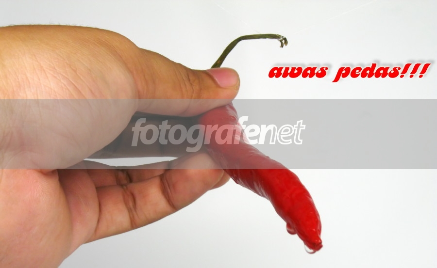 Gimana kalo anglenya diubah. Tangan di belakang *blur*, ujung cabe di depan mempertontonkan bulir air yang bening. Fokusnya di bulir air itu.