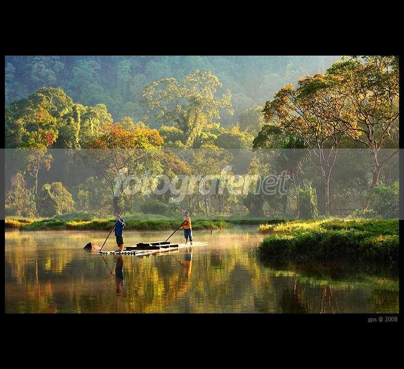 Saya suka komposisi cahaya.. tanpa dikasih judul pun ketahuan kalo ini pagi yang cerah :) Komposisi warna top banget, gelap - terang - pantulan air - latar belakang kabut... bahkan baju yang naik rakit serasi ama keseluruhan background... moment-nya pas!