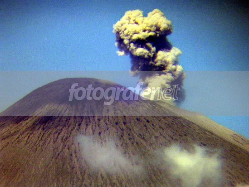 Gunung Semeru (+- 3600 m dpl) setiap +- 20 menit sekali kawahnya terjadi letusan memuntahkan abu dan pasir, membubung ke langit..shg Malang sering hujan abu, lebih tepatnya hujan pasir. rnPuncak Semeru terlihat tanpa vegetasi, akibat hujan pasir tsb..rn[http://id.wikipedia.org/wiki/Semeru]rnrnFoto diambil dg bantuan teropong biasa 10x50mm. Jarak lurus kamera/rumah saya dg gunung +- 32km. (menurut bantuan "hitungan" Google Earth dg menggunakan menu show Ruler)rnrnKarena keterbatasan kamera poket yg dipakai.. mohon dimaafkan dg segala kekurangan di foto ini... termasuk noise yg tinggi (padahal sudah pake ISO 80 T_T).rnrnfoto sedikit di oldig agar foto lebih terang dan berwarna lbh kuat... (dg teropong, gambar selalu UE dan kontrasnya rendah banget)rnSemoga berkenan..rnrnDate Time Original: 2008:05:11 13:10:21rnISO Speed Ratings: 80