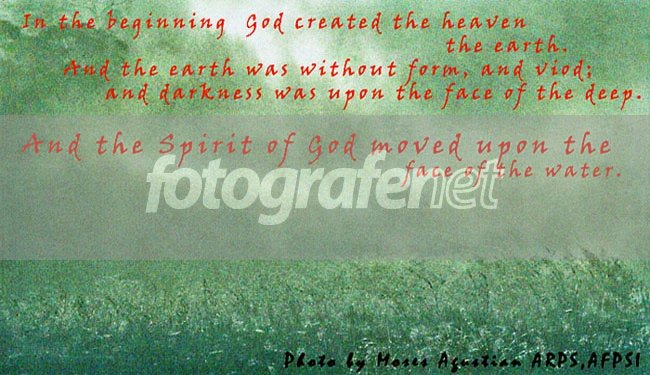 Spirit of God...... foto yg ingin menampilkan mood. Tambahan dari kulo : 7 Juli 08 jam 1.00. Kewajban kulo untuk menjelaskan apa yg sdh di upload: topik mengenai 1. unsur foto. 2. Point o intrs. 3. mengapa ARPS dan AFPSI ? tapi tdk semua hari ini sahabat2. !. UNSUR FOOTOGRAFI dlm fotoku salah tiga atau empatnya: Tektur -Rhythm/irama - Garis -Warna. TEKTUR : ASPAL ITU TEKTURNYA KASAR SEBALIKNYA KAPUK ITU EMPUK....SALAH HALUS. Klalau kita menutup mata kita meraba sebuah benda kita akan merasakan permukaannya kasar atau halus.... tapi kl itu foto manaketehek kata Tora sudiro. jadi apa itu tektur dalam visual ... .rn ? Sebuah permukaan yang dicahayai dengan side light akan membentuk form kecil kecil temannya banyak gitu itu namanya tektur kawan. apa itu form ? kalau terus...bisa bisa aku duduk didepan komputer sampe bisulan. Dan anda bisa melihat secara visual itu kasar atau halus.itu kl objek benda mati tapi gas atau cair spt kabut akan memberi kesan keras kalau dipadu dg hot color. akan tetapi kl di cool color akan memberi nuansa kedalaman/deph.udah ya besok kita lanjutin ke unsur yang minim lainnya dalam fotoku. Tgl, 8 jULI 08 jAM.8.00 PAGI: Janjiku hari ini adalah unsur dasar fotografi nya adalah irama. Sebuah lagu pasti ada nada tinggi dan rendahnya bahkan fals yang saling mengisi bukan saling berlomba bunyi keras. Anda lihat kabut yang melayang itu adalah irama dimana sebelah kiri mulai dari lengkungan menaik kemudian menurun dan terakhir menanjak lagi yang mewakili semagat foto ini diakhiri berbatas format foto. Bisakah anda merasakan sukmamu melayang bersamanya. Gile sampean....!!! hahahaah. Hari ke 3 tgl 9/7/08 jam 6.00sore. Unsur lainnya adalah garis dan warna.... Kalau kita menggariskan sebuah grs horisontal pd kertas putih kemudian coret sebuah grs lagi dg posisi diagonal hingga menyentuh grs hprisontal tadi .... amati dan rasakan ada kesan kuatir grs diagonal akan jatuh krn gaya tarik bumi , kesan gerak inilah yang membuat grs diagonal menjadi grs dinamis. spt grs sinar putih di foto ini dimana warna dingin dan tektur kasar menjadikan mood lebih kuat. PIO nya kalau kita rontokkan huruf2 ....mata akan tertuju pada permainan kabut dan tidak akan lari drpdnya. Yang mengatakan ini hanya spt sebuah kartu ucapan memang tepat krn saya menempelkan Firman Kitab kejadian 1:1. Pada mulanya Allah menciptakan langit dan bumi.........dan Roh Allah melayang layang di atas permukaan air. Jadi hanya sebuah background yang cocok saja. terima kasih memang sahabat2ku ini semua benar adanya. Bagi yang melihat fotonya aja krn di FN tentu fotolah yang menjadi jujuan nya dan huruf merah2 sangat mengganggu juga benar ...salut dengan melihat lebih dalam , Bahkan seorang sahabat melihat foto ini 62x dimana pd awal sdh memberi nilai jempol kebawah akhirnya beliau mengerti dan mengata kan dg jelas padaku spt yg kumaksud. Sungguh salut atas keuletannya. Terima kasih pada semua yg memberi komentar... sahabat. Marilah kita sama sama belajar melihat dari sisi pemotret apapun karya yang akan disampaikan nya . GBU