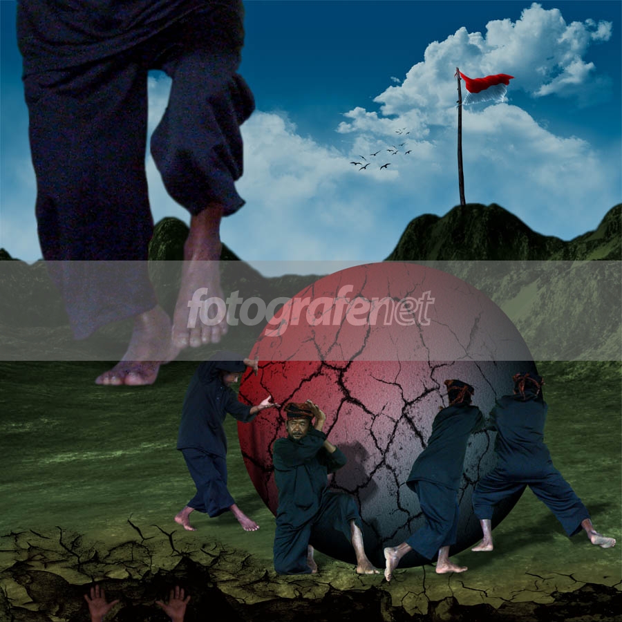 Surem-surem tilangkoro kingking.. Lir mantoro kang ayun... Ooooo...rnrnrnKocap kacarito, "Bumi Nusantara", gonjang-ganjing bagaikan ditendang oleh “Kaki Raksasaâ€, menggelinding jatuh dari “Puncak Gunung Impian†hingga ke tepi “Jurang Keterpurukan“, retak dan nyaris hancur berantakan, tercerai berai. Telah banyak korban yang berjatuhan dalam peperangan kasat mata tak berkesudahan ini. Krisis moneter, krisis ekonomi, krisis pangan, krisis energi, terorisme, korupsi, kriminalitas, konflik antar suku, konflik antar agama, bencana alam, dan masih banyak hantaman dahsyat lainnya.rnrnLantas, apakah kita harus menunggu datangnya tokoh mitos, seorang pahlawan yang bernama “Satrio Paningitâ€?rnrnAh... Bukankah Tuhan telah membekali kita dengan kecerdasan? Kecerdasan yang pasti mampu membawa kembali bola “Bumi Nusantara†ke “Puncak Gunung Impian†yang merdeka. rnrnItulah “sustainagilityâ€, bagaimana kita seharusnya senantiasa memelihara kecerdasan kita untuk melakukan perubahan ke arah yang lebih baik. Yakinlah bahwa kita semua adalah makhluk Tuhan yang cerdas. Jangan percaya pada mitos bahwa hanya bangsa tertentulah yang memiliki kecerdasan.rnrn***rnrnTerima kasih telah berkenan untuk turut memperbaiki bengkel foto-foto saya yang masih berbenah. Keterangan teknis dan foto-foto yang menjadi sumber seni reka digital ini bisa dilihat di blog saya di link ini: rnrnrnhttp://das4fn.blogspot.com/2008/08/sustainagil ity.htmlrnrnrn***rnrnSumber inspirasi:rnrnrn[1] Digital alteration:rnrnrn„Bendera Terakhir“ (Mas Final Toto) dan „Gulliver in New York“ (Pavel Kaplun). Tapi, meskipun terinspirasi oleh Mas Final, karya saya ini gak final-final... Masih draft terus... hi hi hi hi hi :Drnrnrn[2] LagurnrnrnLagu-lagunya "Disturbed": "Stricken" (http://www.azlyrics.com/lyrics/disturbed/stricken.html) dan "Land of Confusion" (http://www.azlyrics.com/lyrics/disturbed/landofconfusion.ht ml)rnrnrn***rnrnrnrnKaki raksasanya pecah ya? Ma'af ya... Hasil perbesaran 3x dari resolusi 96 dpi... Mohon maklum... Samsung S630 :) **(maksa'in sih)rnrnrnJadi kepikiran Mak Erot... Gimana kalo "anunya" resolusi rendah lalu diperbesar yak? Pecah dong ya.... Wakakakakakak :D