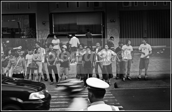 menunggu giliran nyeberang kayaknya nih om...... karna gak boleh kendaraan brenti di zebra cross....... hehe........ :D btw, suananya terekam komplit...... mantab :D