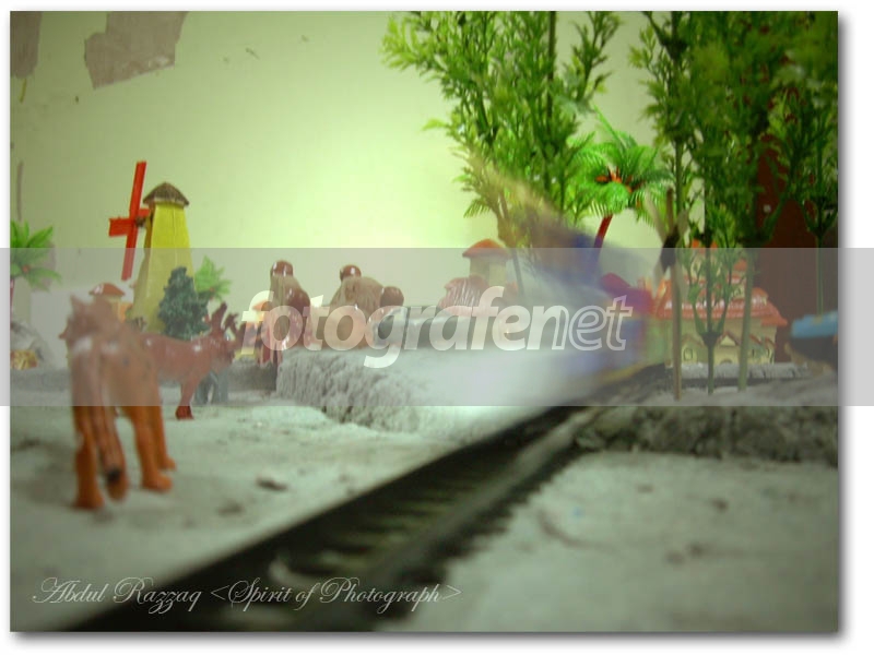 maksudnya foto model kereta api yang berjalan dengan kecepatan penuh ya?... kalau itu maksudnya fokusnya ke rel kereta apinya aja jangan ke latar belakangnya.... semoga berkenan. jepret terus.