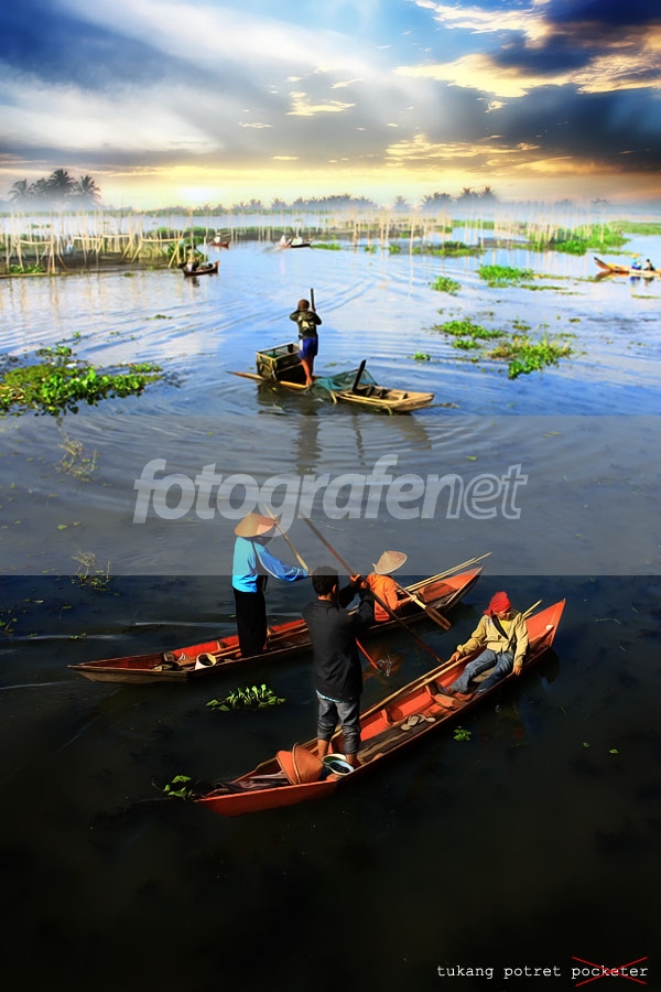 Date Time Original: 2010:03:06 08:10:36nISO Speed Ratings: 100nKonsep dari foto dibuat dengan memotret satu sudut saja tetapi obyek utamanya bergonta-ganti. Yang pertama di potret adalah nelayan yang ditengah, kemudian sekitar 10 menit kemudian ada perahu lewat pada sudut yang sama dilanjutkan perahu ketiga. Kemudian foto digabung menjadi satu. Karna tonalnya sama maka proses masking menjadi sangat mudah.....Nyanyian Nelayan mengantarkan mereka ke tengah rawa.nnObyek pilihan: Nelayan, perahu, rawanSetting kamera: semua RAW, Landscape, Sharpen +7, Saturation 0, Contrast +2, Color Tone +2, flash off, aperture value rata-rata 6.3nOlah digital:n1. kolase 3 foto dalam frame dan sudut pengambilan yang sama dengan teknik masking. Sedikit level pada masing-masing foto untuk lebih menyamakan tonal.n2. Koreksi langit dan awan dgn teknik masking sederhana.n3. Dodging dan burning secukupnya, terutama pada horison dan perahu.n4. Blending option dipindah ke overlay untuk mendapatkan warna kentaln5. Level diturunkan sedikit agar tidak terlihat OEn6. Selesai.nnSemoga berkenan dan terima kasih sudah mampir di galeri memberikan kritik, saran dan semangat mujarabnnSalam hangat selalu dari Salatiga kota kecil nan sejuk